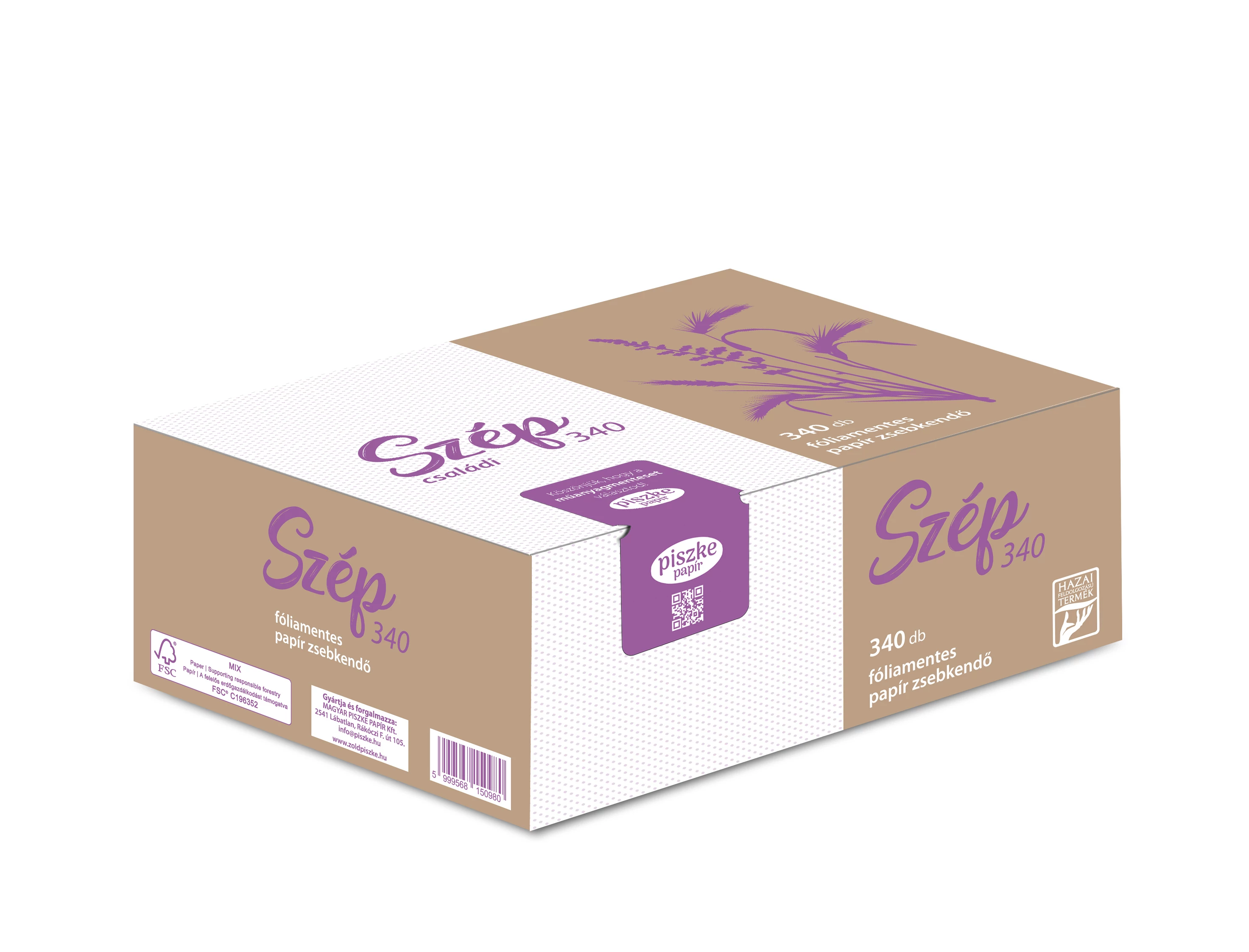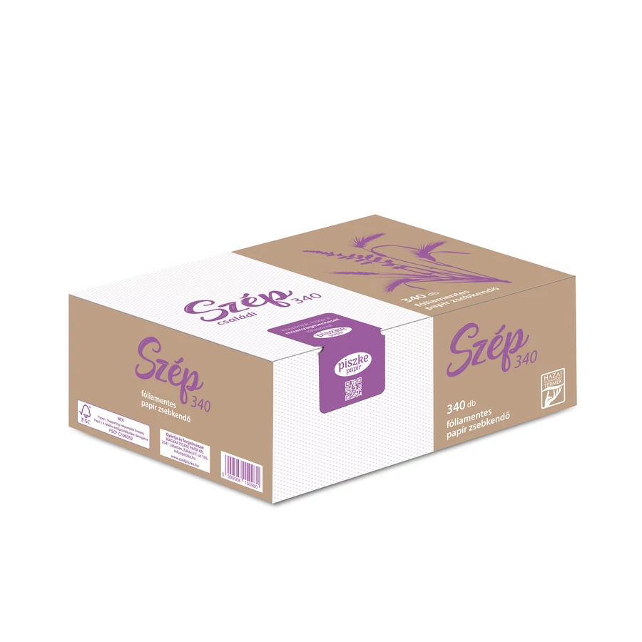 A hazai Magyar Piszke Papír Kft. ökotudatos központi filozófiáját követi a Szép termékcsalád is, így papírzsebkendőinket is magasabb lapszámmal és kevesebb csomagolással érheted el. A csomag fehér színű, illat- és festékanyagmentes papír zsebkendőket tartalmaz mindennapi használatra. Nagy kiszerelésének köszönhetően szállítása környezetbarátabb, mint az egyesével csomagolt papír zsebkendők esetében. Fóliamentes csomagolásban, újrahasznosított papírdobozban kapható.
